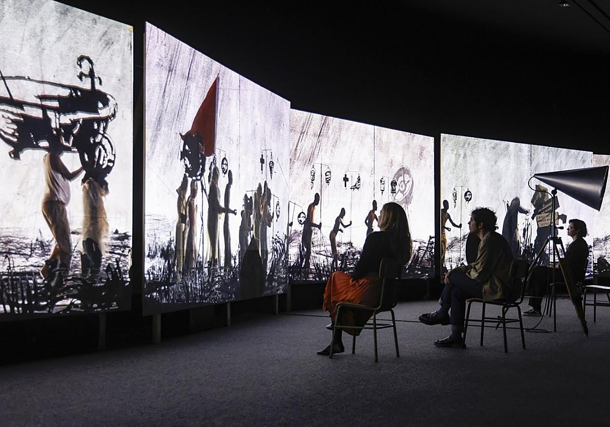 From outside the hall, the sound of trumpets from the procession echoes faintly, acting as a call, a beckoning to enter. Visitors cross a small, dark corridor, their eyes adjusting gradually to what lies ahead. Then the spectacle begins: 40 metres of a continuous, unbroken procession that celebrates life through the lens of death. William Kentridge returns to Malaga with More Sweetly Play the Dance, a "magnificent" video installation spanning eight screens. Blending filmed images, animated drawings and music, it serves as both a poignant acknowledgment of mortality and a powerful act of defiance against it.