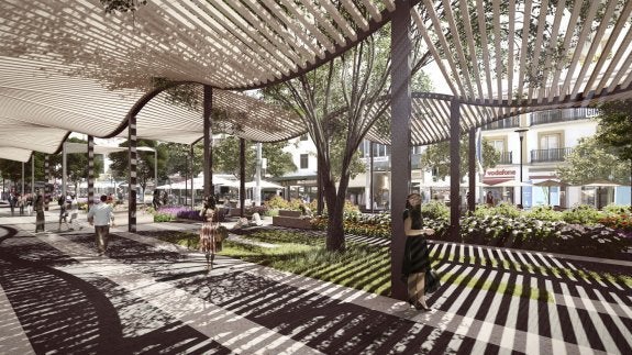 A pergola reminiscent of the Palmeral de las Sorpresas in Malaga will cover the central space of the square. This is one of the most striking elements of the project and is designed on a support of metallic grey pillars holding a concave bow and a convex arc whose concatenation creates ripples in both directions.