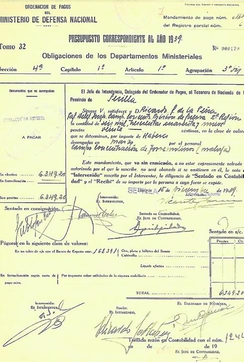 Another document details the costs associated with running the prison; the warden validated the invoices, which were reviewed by the chief accountant, the auditor and a tax office representative. For example, 6,349 pesetas were sent from Seville to pay for the concentration camp to be run on 30 and 31 March 1939.
