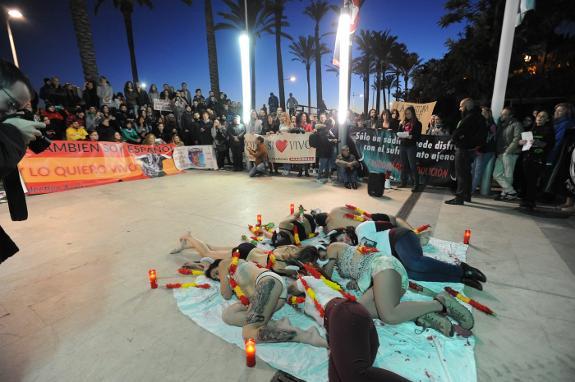 The demonstration ended with a theatrical performance in which some of the protesters, wearing just underwear, pretended to have been stabbed with banderillas (lances used in bullfighting) while others called for bullfighting to be made a criminal offence.