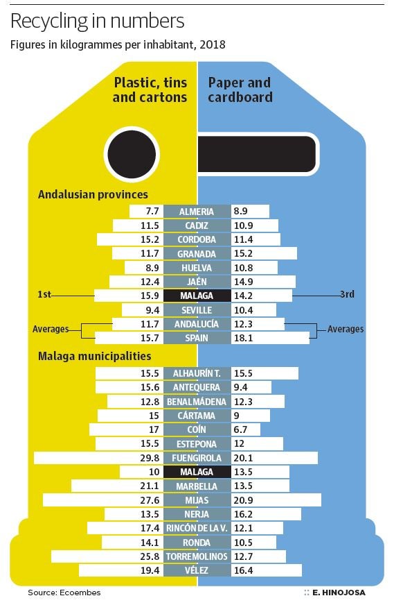 In Malaga province, every inhabitant recycles 15.9 kilos of plastic, tins and cartons and 18.1 kilos of paper and cardboard a year