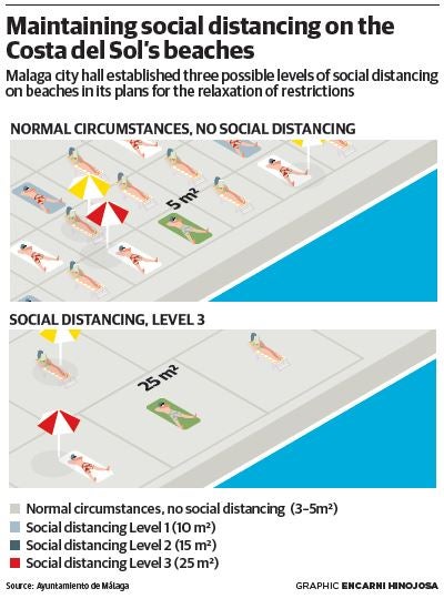 The contingency plan being drawn up by councils has to set a maximum number of users allowed on the beaches. How many should this be? The Junta doesnt specify this, just refers to Health authority guidelines. However, it has said that on some beaches the capacity might have to be reduced to 50 per cent. It also recommends a distance of at least two metres between users, marked by signs on the ground, and all personal items such as towels, bags and cool boxes will have to remain within that safety perimeter.