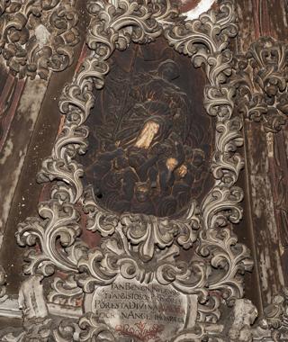 The plasterwork on the dome of the chapel is very impressive. It has been blackened by fire but even this cannot hide its early polychromy. Eight reliefs of the Virgen de la Aurora stand out.