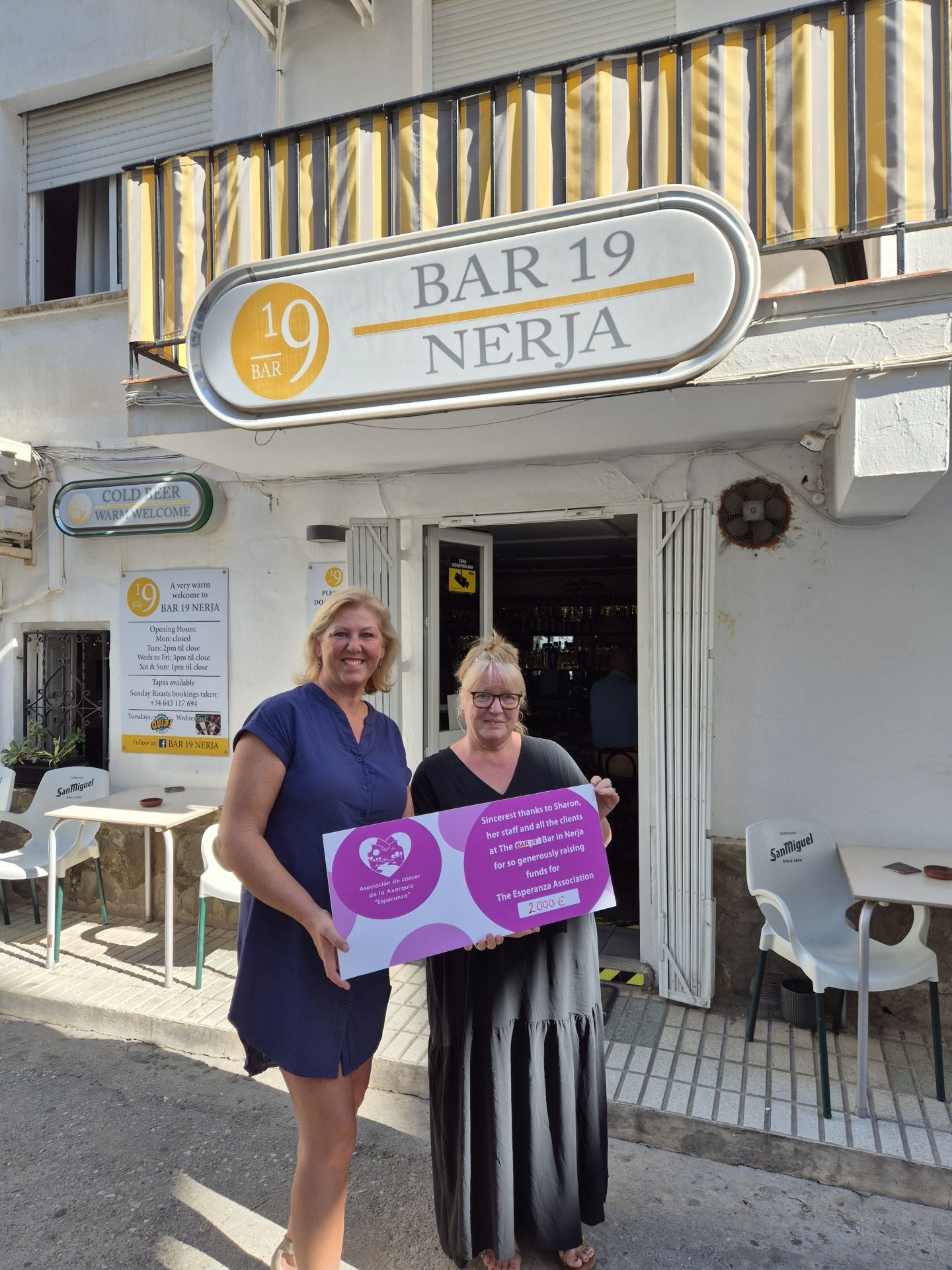 The owners of Bar 19 in Nerja on the eastern Costa del Sol have raised 2,000 euros in aid of Asociación Esperanza, an Axarquía-based organisation that supports people with breast cancer and their families.