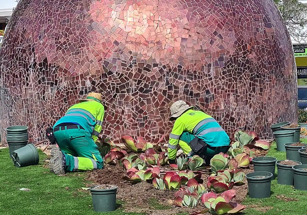 "Glass as a decorative element is used in the Canary Islands and the result is fantastic, so we have seen fit to import it to our municipality. In addition, we will continue to innovate, managing in an orderly and rigorous manner, because we all have to make an effort against drought," said the councillor for Parks and Gardens, Daniel Gómez, who said that in the coming months, the work will progress to all the town’s roundabouts.