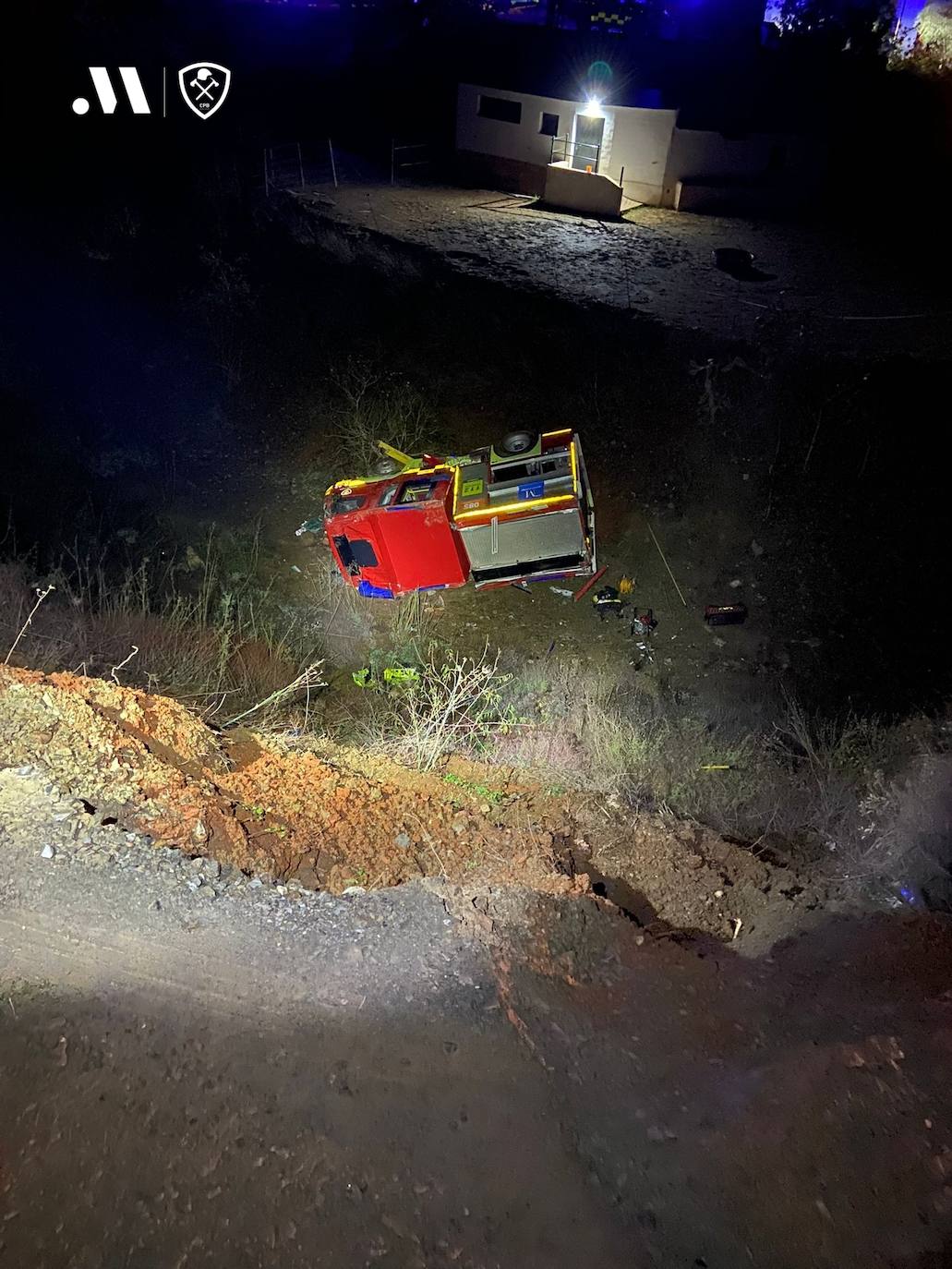 The accident happened around 3am, at kilometre 2 of the MA-3202, when the road gave way under the right rear wheel of the fire engine and the vehicle toppled down the embankment, rolling over several times.