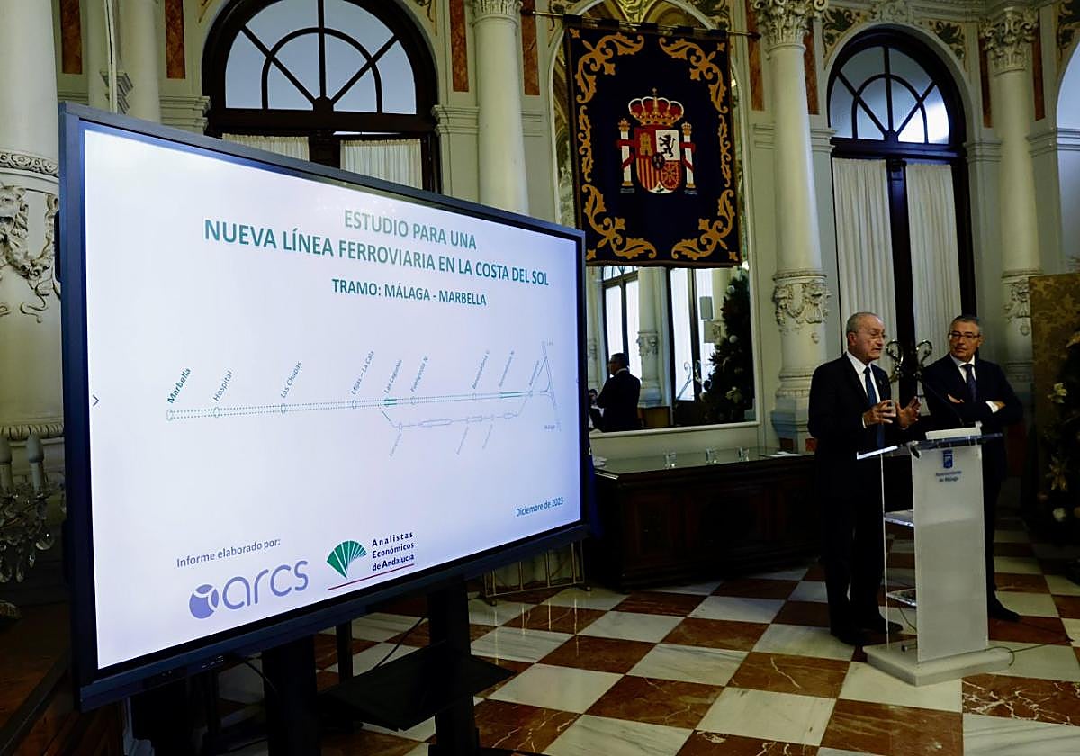 Connecting Malaga city and Marbella by train is an old aspiration that has notched up as many false dawns as different railway formats proposed for it. On Thursday this week, Malaga city hall hosted the presentation of a study written by veteran engineer José Alba and attended by the city's mayor, Francisco de la Torre, and the president of the Diputación provincial authority, Francis Salado. Their aim was to kick start a new project against the background of so many unfulfilled promises over the years.