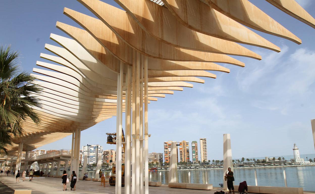 The pergola is the main feature of El Palmeral de las Sorpresas in Malaga port, and its award-winning design is by architect Jerónimo Junquera. It is 400 metres long, 11 metres high and 265 white reinforced concrete slabs hang from it. White? Well, they have been stained brown for the past two months but, thanks to these works, they will soon be back to their original immaculate appearance.