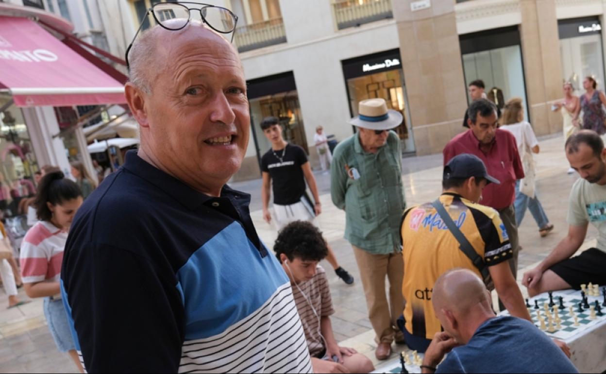 "I'm here, to enjoy a little chess," said Juan Garrido as he arrives by bicycle to calle Larios in Malaga to face a chess game with a complete stranger. It is the second week in a row that Juan has come to this tourist hotspot to play.