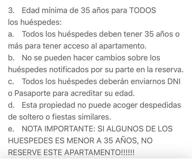 The association has verified that, as indicated in the flat's Booking.com profile, one of the "house rules" is that only people of or over the age of 35 can check in and access the accommodation.