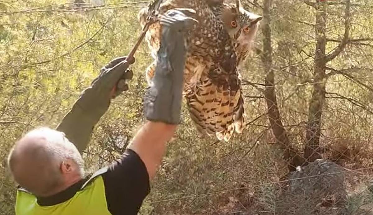 Watch as police rescue trapped eagle owl from a barbed wire fence in Malaga