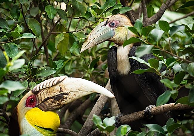The black-throated hornbill is one of the most characteristic birds of the tropical forests of southeast Asia. It is charismatic and colourful but, unfortunately, it is threatened by poaching and habitat destruction. The clearing of large areas of rainforest has reduced the forests on which these birds depend for breeding, food and shelter, as reported by staff at Bioparc. The most recent studies carried out by the IUCN (International Union for Conservation of Nature) classify this species as 'vulnerable', so it meets one of the five criteria that would put it on the IUCN Red List of endangered species. Its population is decreasing and, if this continues, it could be reduced by up to 50% in 50 years.