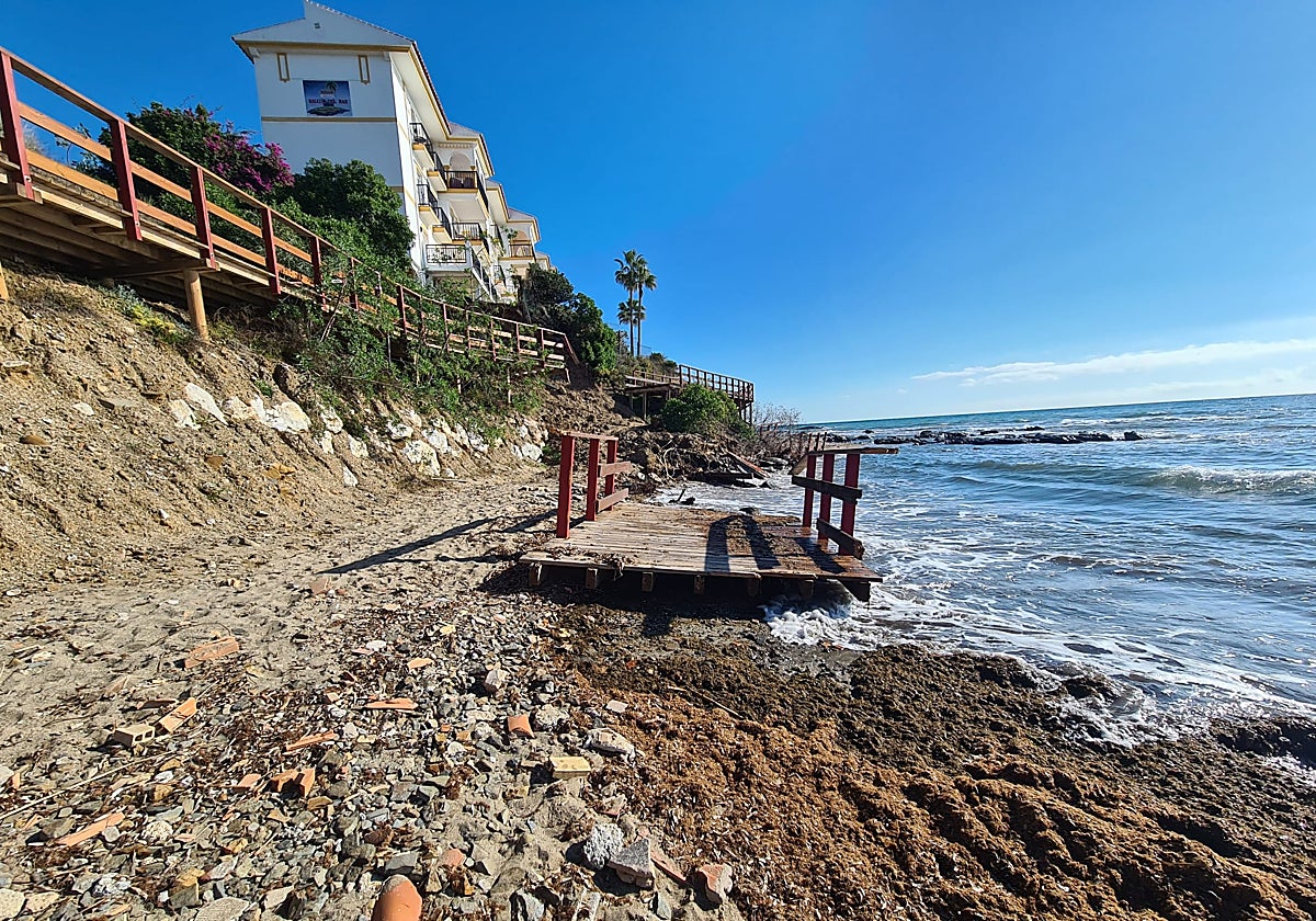 It has been two months since a water leak in the Balcón del Mar residential development on the seafront near La Cala de Mijas, where the Senda Litoral coastal path in the Torrenueva area passes by, caused the ground to collapse. With it, part of the wooden walkway that forms the route at that point also broke away. However, the damage remains on the beach with town hall saying it is the responsibility of the local residents to fix it.