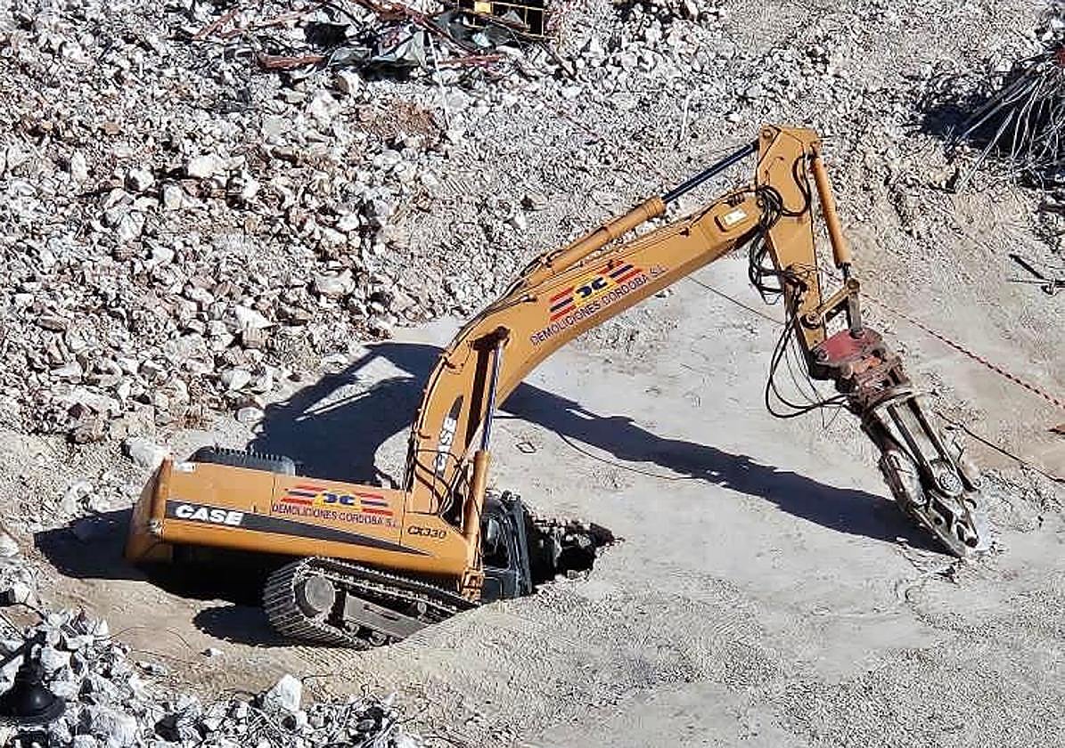 The ground has opened up on a demolition site Fuengirola and caused an excavator to topple into a hole where work is currently under way to demolish the old Mercacentro market building in the Costa del Sol town. At the moment the cause of the accident is unknown, according to council sources, although it is believed that the driver of the heavy machinery did not suffer any injuries and that he was able to make his own way out of the excavator.