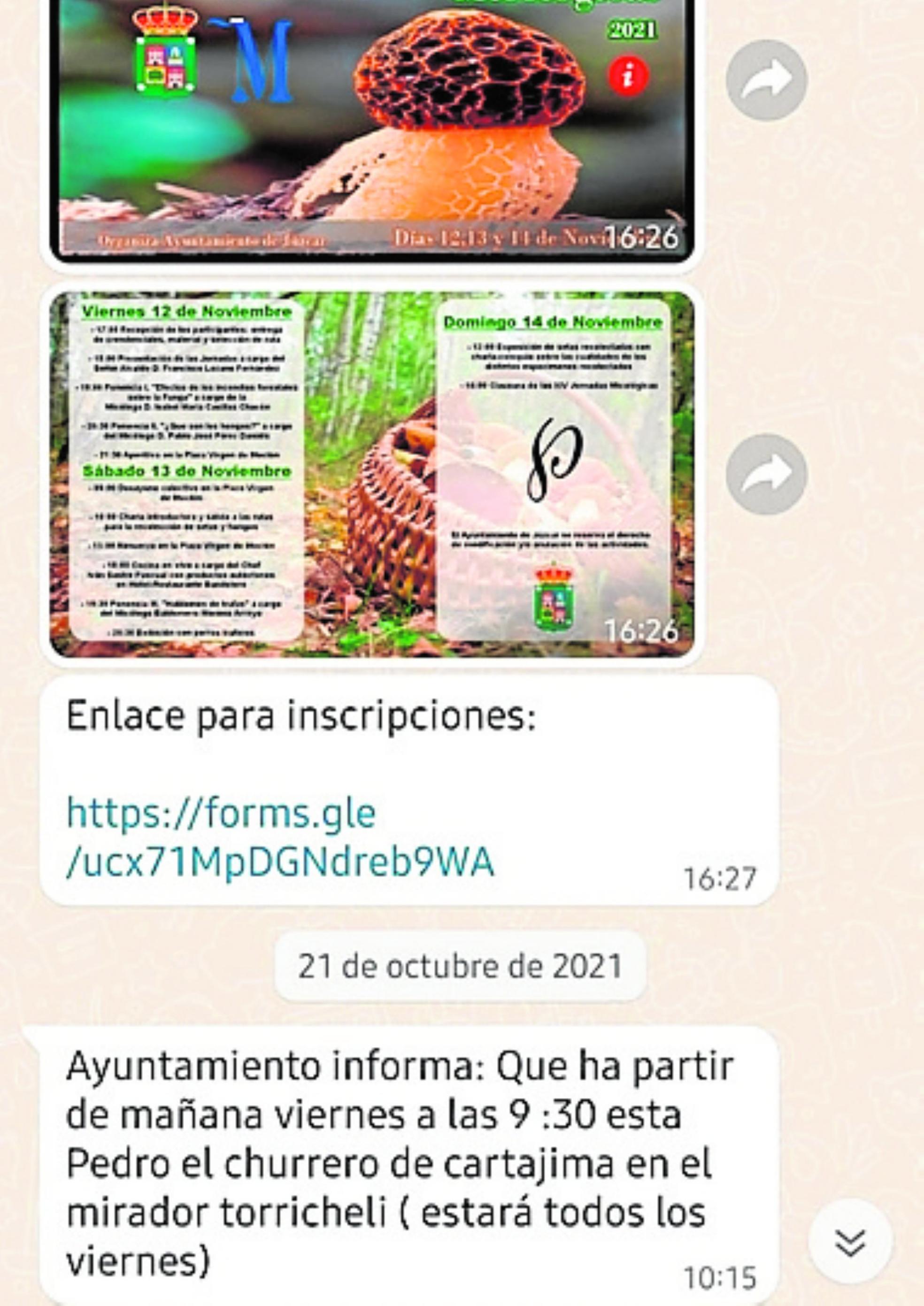 Examples of events published on the WhatsApp chat have included the delivery of books and materials, free of charge, to the village school; the celebration of the traditional Mycological Days and the opening of the churros shop on Fridays next to Bar Torricheli.