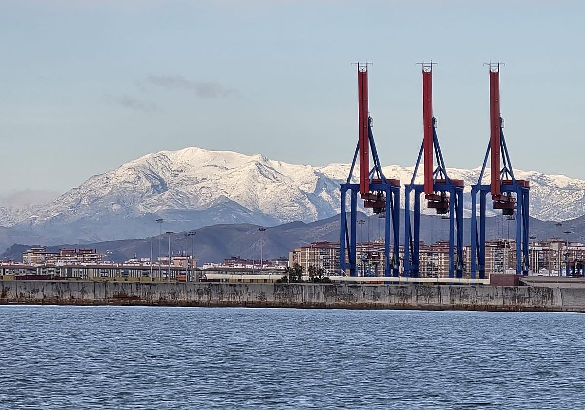 Snow on La Maroma seen from Malaga port.Jabegotes de la Bahía
