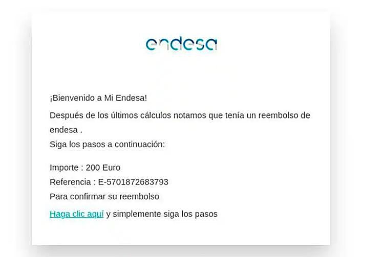 Incibe has recently warned of an Endesa impersonation campaign, via fraudulent e-mails, in which the victim is informed of a supposed billing error for which a refund of 200 euros is to be made. To do this, they divert you to a website that claims to be the official Endesa customer area, where they will be asked for a series of personal data and data linked to the credit card (card number, expiry date, security code and PIN).