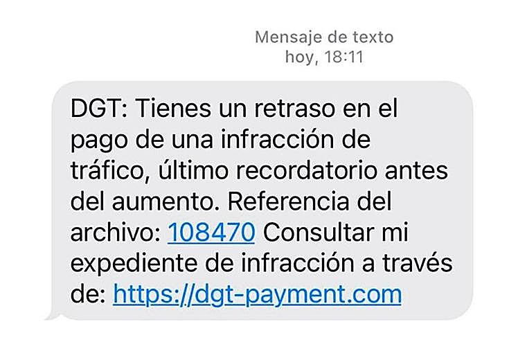 A 'smishing' campaign (text messages or SMS with fraudulent purposes) has also recently been detected in which the identity of the Spanish directorate-general for traffic, DGT, is impersonated. These messages inform recipients that they have an unpaid fine, and invite them to pay via the link provided. In this way, cybercriminals obtain personal and bank details.
