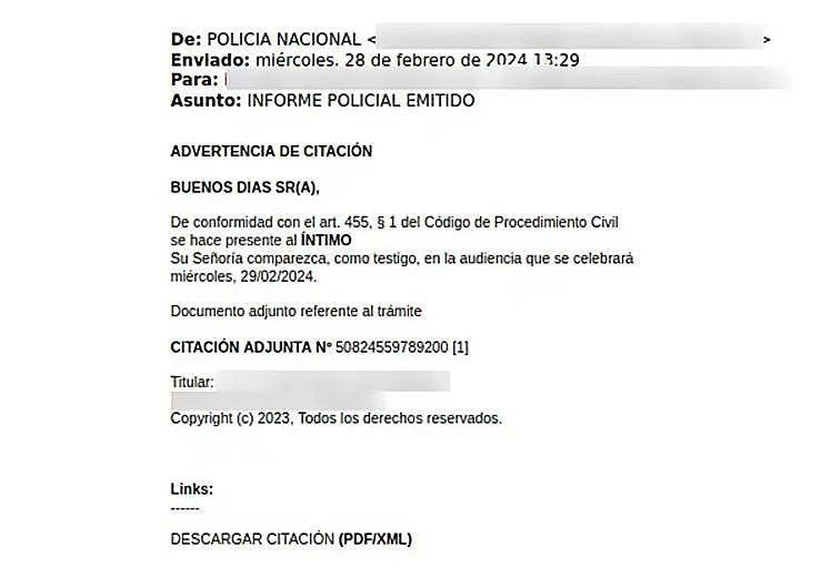 Incibe warns of a phishing campaign that impersonates the National Police in order to distribute malware (malicious software) through notifications that refer to a supposedly issued police report and a summons warning, requesting the person receiving the email to appear as a witness at a hearing to be held on a certain day.