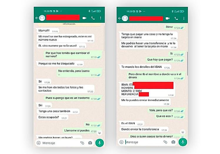 Last Christmas marked a real epidemic of this WhatsApp scam. The scam is carried out through a message in which the offender pretends to be the recipient's son or daughter, says that they have lost or had their mobile phone stolen and asks for a sum of money via a transfer to quickly solve a problem (e.g. to buy another mobile phone).