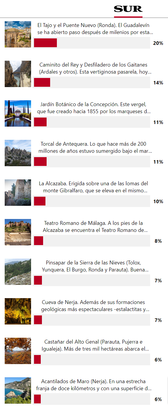 These are the seven 'treasures' as chosen by the voters: The gorge and 'new bridge' in Ronda, Caminito del Rey and Desfiladero de los Gaitanes (Ardales and others), Jardín Botánico de la Concepción, El Torcal de Antequera, La Alcazaba de Malaga, the Roman Theatre and, finally, the Pinsapar de la Sierra de las Nieves (Tolox, Yunquera, El Burgo, Ronda and Parauta).