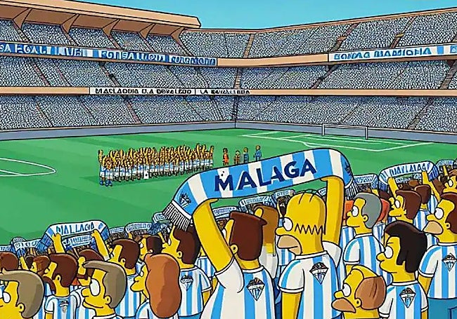 The Simpsons are in the stands at La Rosaleda cheering on Malaga CF, even wearing the team's shirts.