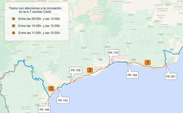 Road closures are expected between 9am and 3pm, depending on the pace of the athletes, and the A-7 section will affect kilometres 201 to 146 between La Cala de Mijas, Marbella and Estepona, of the carriageway heading towards Cadiz. Yesterday the DGT information panels on the highway announced the closures, due to a sporting event.