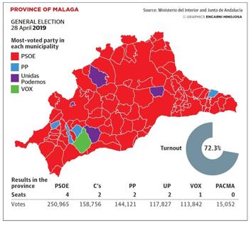 Malaga province returns a total of 11 MPs to Madrid's Congreso. Once the count was in, the PSOE had four seats, up one on three years ago, Cs kept their two and the PP had lost two of its previous four. Unidas Podemos kept its two MPs and Vox won one local MP for the first time.