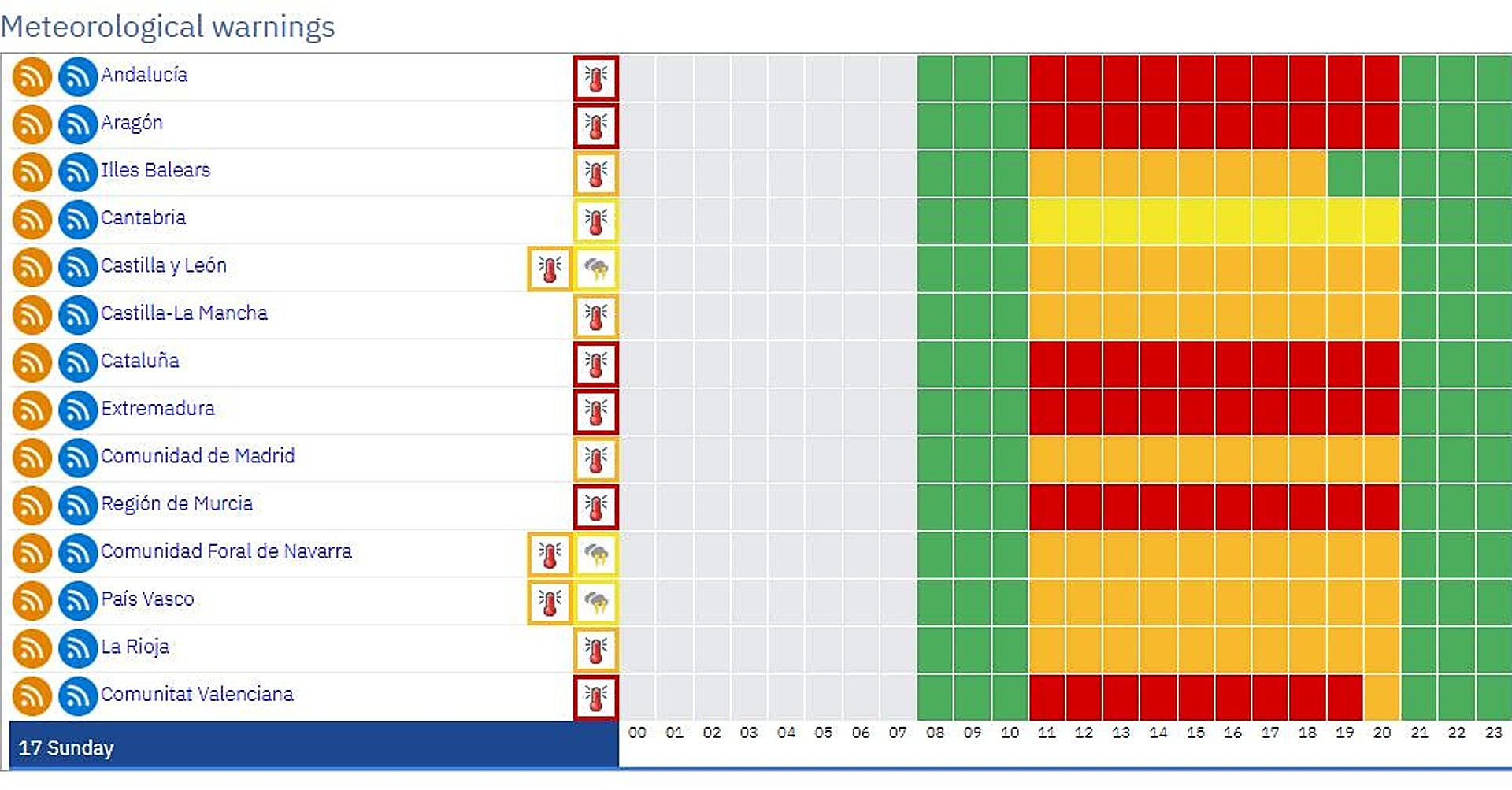 Today (Sunday 17 August), red warnings will continue to be active in Tarragona and Seville. These provinces will also be joined by the coastline south of Alicante, the countryside of Cordoba, the Ribera del Ebro (Zaragoza), the central depression of Lérida and the Vega del Segura, in Murcia, where up to 45C could be recorded.