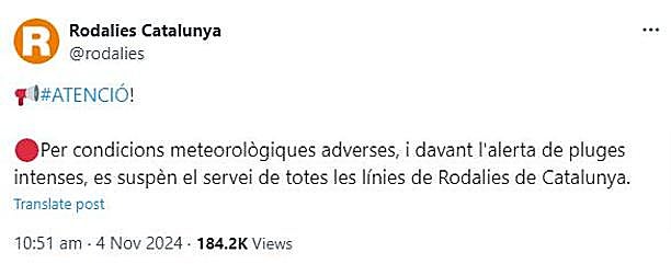 Flights diverted, roads blocked and local train services suspended as red alert activated for torrential rain in Barcelona