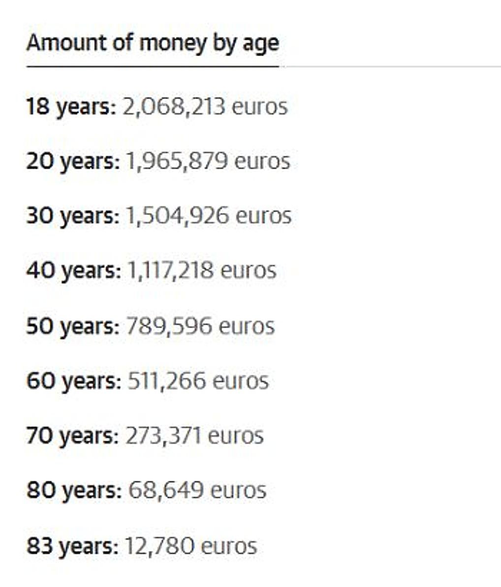 The study estimates that an 18-year-old needs just over two million euros to be able to get by without depending on a salary. As the years go by, this amount reduces considerably "because it is assumed that we have already passed an important part of our working life and have generated income or have some savings", argues Pinedo. For the parents of this 18-year-old, 789,000 euros would be enough to be able to leave their respective jobs and live off the lottery prize until the end of their lives.