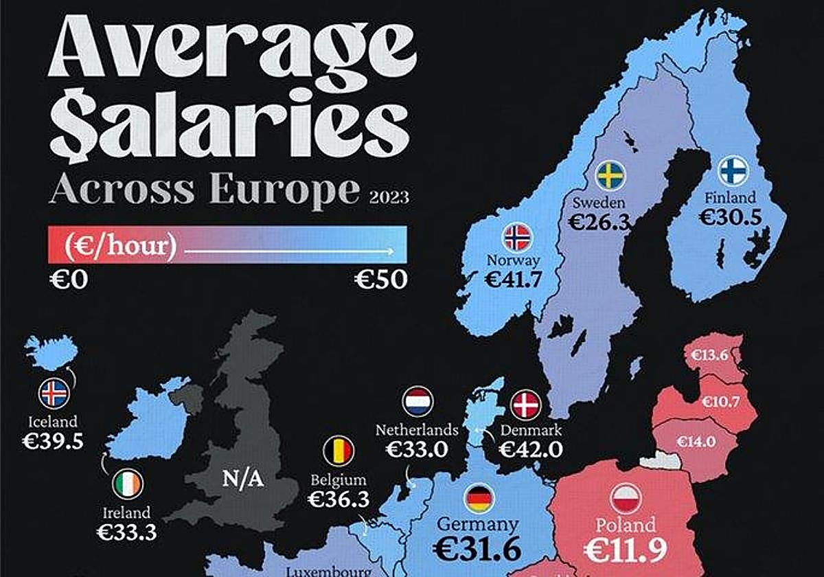 Have you ever wondered how much a worker earns per hour in other European countries? The Voronoi app, taking Eurostat data from 2023, has developed a map that shows Spain to be below the European average in the hourly rate of pay, currently set at 24 euros per hour. Spain shows up rather differently to its European neighbours. Thus the bluer the country is on the map, the higher the hourly wage. Interestingly, the results range from 47.20 euros per hour right down to eight.