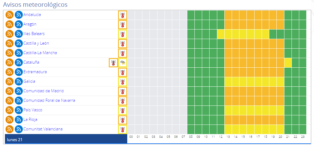 The thermometers will continue to rise this Monday in one of the "peak days" of this new heatwave. A total of 35 provinces in Spain will be under amber and yellow warnings for high temperatures. Until Thursday there will be a progressive rise in temperatures in much of the mainland and the Balearic Islands, due to strong sunshine on a warm and stable air mass, according to Aemet. The high temperatures will be especially prevalent in the northeast quadrant of the mainland and the basins of the major rivers.