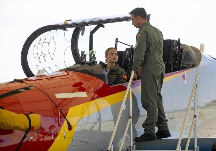 The princess climbed into one of the Pilatus aircraft in the hangar of the air base. She was accompanied by Commander Alberto Guzmán - the flight instructor who flew the Pilatus of King Felipe VI on 14 June, when he visited the academy on the occasion of the Aire25 festival, organised as a farewell to the Águila patrol and the C-101.