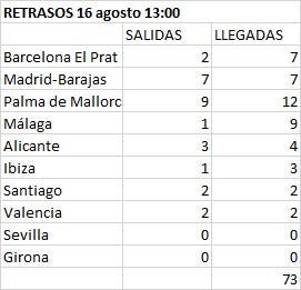 Today (Tuesday, 16 August), as at 1pm, a total of 75 flights had been affected: with 2 cancellations and 73 affected by delays at Spanish airports. According to unions the airports affected by the cancellations are Madrid-Bajaras and Santiago de Compostela. As for the delayed routes, 9 have been registered at El Prat, 14 at Barajas, 21 in Palma, 10 in Malaga; 7 at Alicante, and 4 in Ibiza, Valencia and Santiago de Compostela.