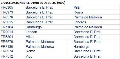 Spain's Unión Sindical Obrera (USO) trade union has detailed the cancelled and delayed flights this Monday (25 July) due to another day of industrial action by 1,900 Ryanair cabin crew at the airline's ten bases throughout the country.