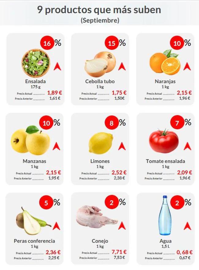 The OCU pointed out that those products shown in the image above are the ones that have experienced the highest price increases since July. In the basket as a whole, salads, onions, oranges and apples are among the foods that have risen the most. All food products that have risen the most belong to the fruit and vegetable food group, according to the OCU's findings.