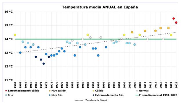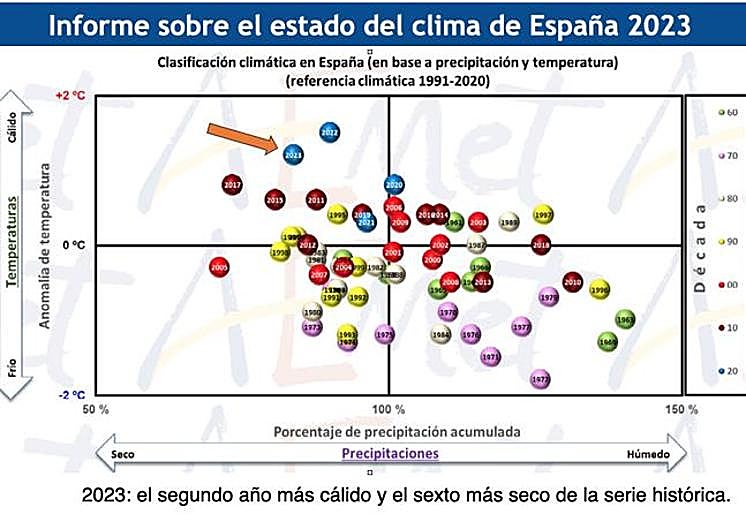 The report, which analysed in detail the most important aspects of the weather and climate throughout 2023, points out that in the last decade there have been 196 warm-day records for only seven cold-day records, which gives an idea of how global warming, caused by greenhouse gas emissions, is hitting our country, increasing the average temperature of the reference period 1991-2020 by 1.2C and by 1.5C since 1961.