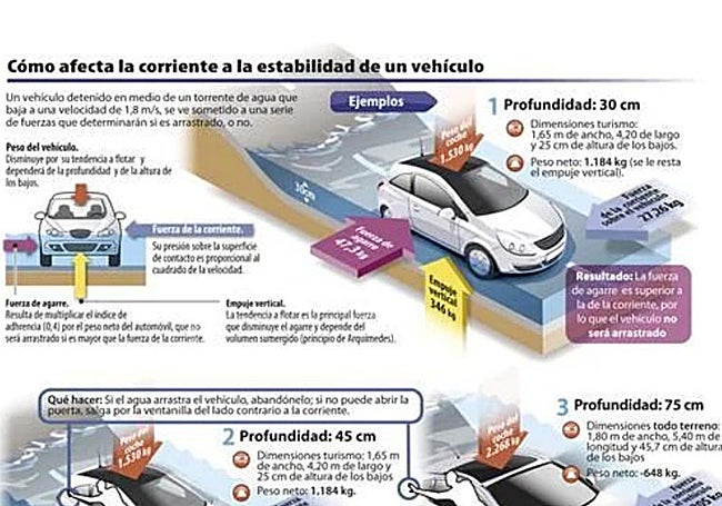 According to experts in the DGT's 'Tráfico' magazine the belief that a vehicle is safe from the force of the water is false. Even at a depth of 30-45 centimetres a driver can start to lose control of a car and if the depth reaches 60 centimetres, the vehicle, regardless of its size, can be swept away by the current.