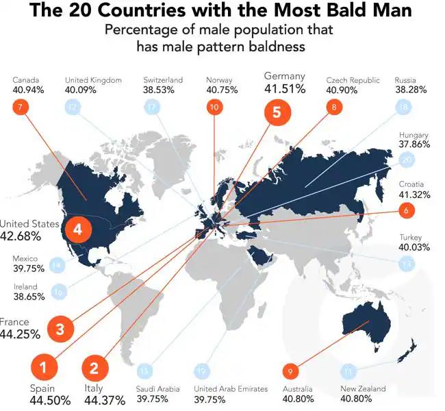 Countries with the most bald heads in the world