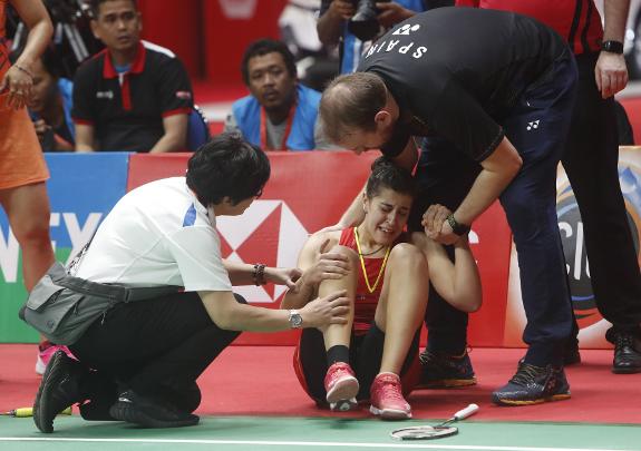 Olympic badminton gold medallist Carolina Marín is a doubt for the World Championships in August after suffering ligament damage to her right knee during Sunday's Indonesia Masters final against Saina Nehwal.