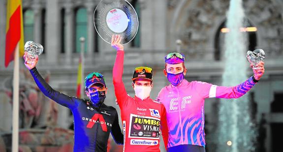 The Slovene was joined on the podium by British rider Hugh Carthy, the surprise package of the three-week race, rescheduled from August