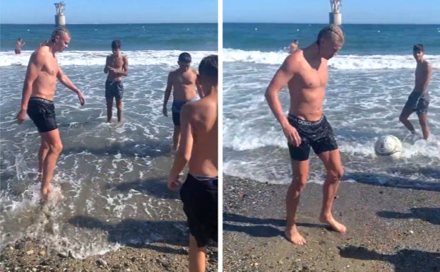 Recent Manchester City signing Erling Haaland has been spotted on one of Marbella's beaches playing in a casual game of football with some of the local children.