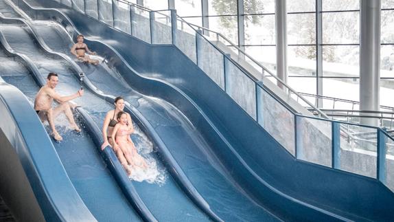 A striking modern water theme park, with flumes, water canyons, surfing, a climbing wall, as well as a spa.