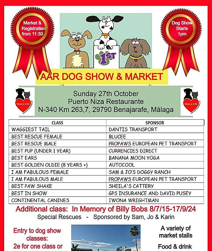 Axarquía Animal Rescue’s (AAR) dog show and market is taking place on Sunday 27 October at Puerto Niza restaurant in Benajarafe on the eastern Costa del Sol. The market and show registration open at 11.30am and the show itself starts at 1pm.