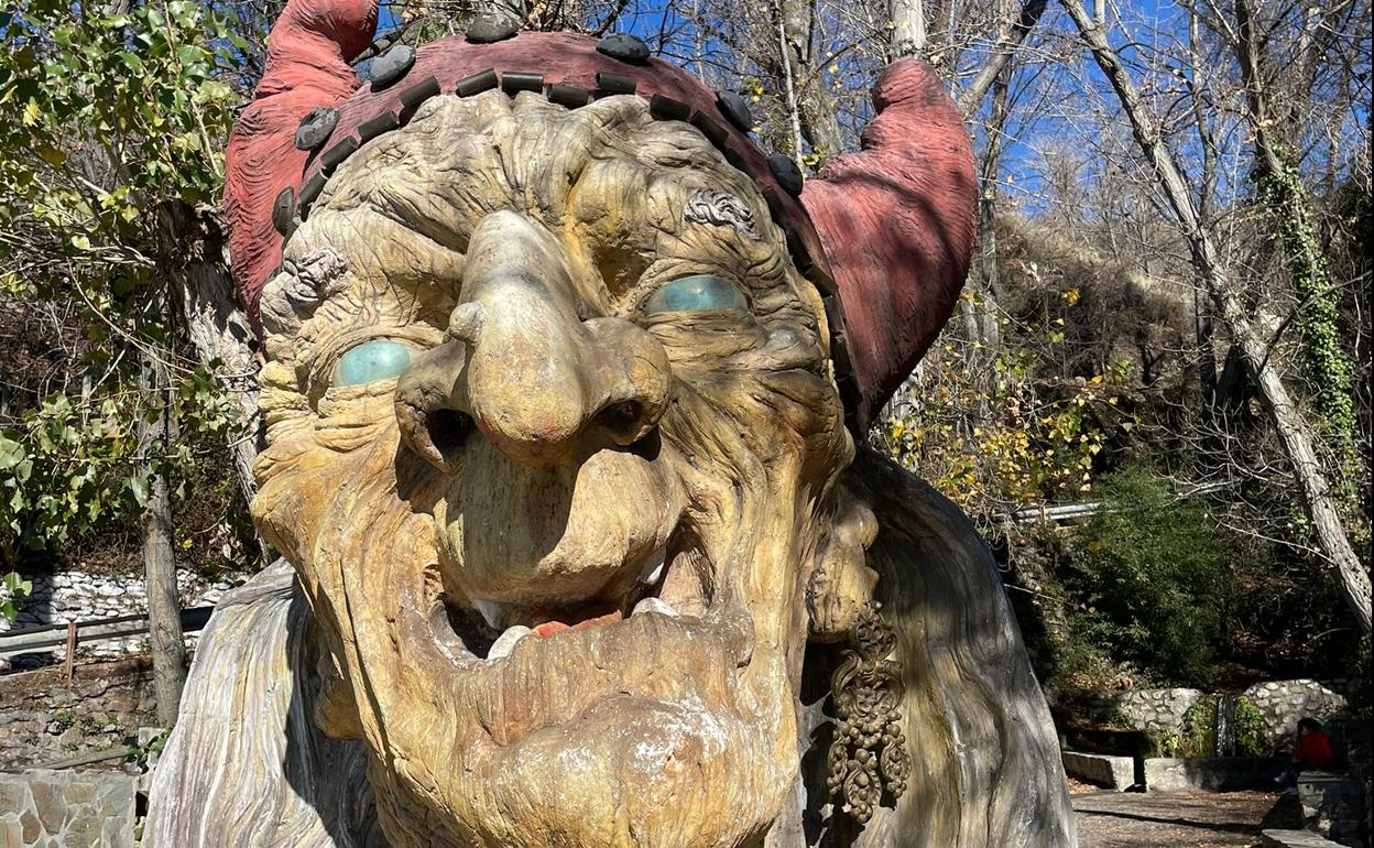 Before heading into the centre, we stop to look at the impressive views from one of its lookout points, which José says is the perfect place to watch the sunset on clear days. “You can even see the mountains of Africa, it’s fabulous,’ he says. We then walk towards an enormous sculpture representing the head of Baba Yagá, the first surprise which, like most of the other figures on the route, is the work of José Vera. It is a witch with penetrating blue eyes and a toothless smile who, according to legend, used to eat children who behaved badly. The sorceress – a character from Slav mythology who was said to live in the forests of Russia – used to inhabit a house with hens’ feet which is also tucked away in the narrow streets of this village.